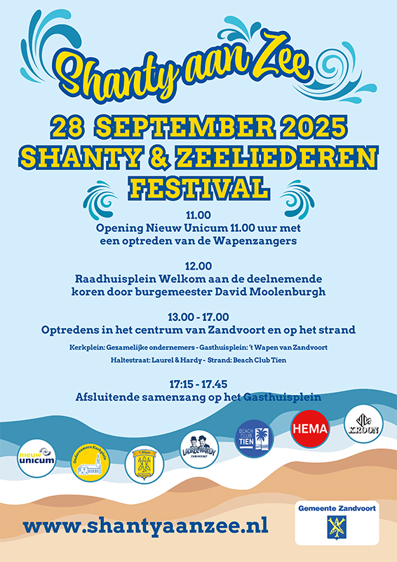 Kom zondag 28 september 2025 naar Zandvoort en laat u onderdompelen in de muziek en zang over de zee en het zeemansleven! De koren komen graag en uit alle windstreken naar ons mooie dorp om voor u te zingen. Ze verdienen veel publiek.